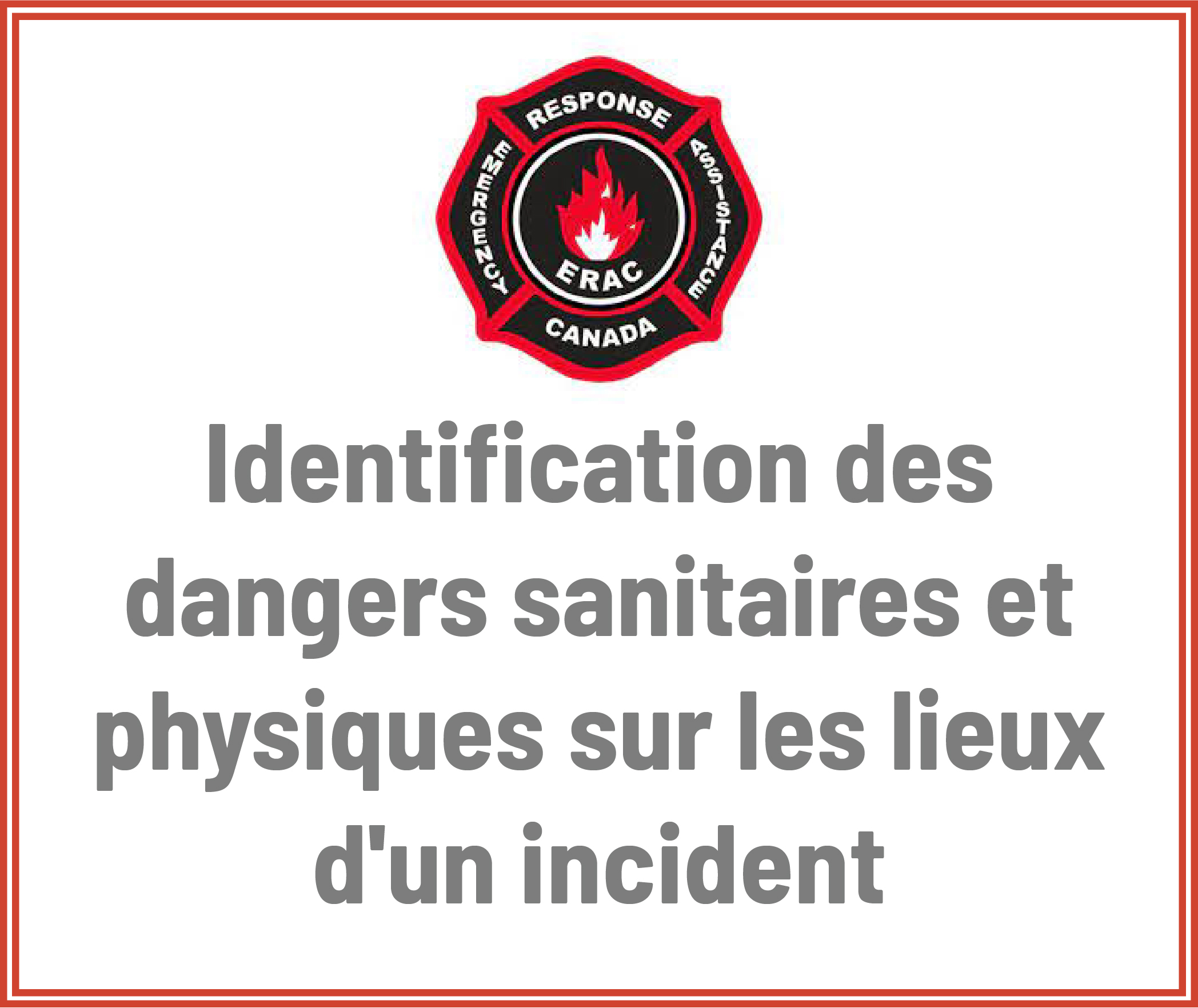 Ce cours permet aux intervenants de l’AIUC de comprendre les dangers physiques et sanitaires de base qui sont présents lors d'un incident. Il examine de près les quatre principales voies de pénétration d’un produit chimique dans le corps et les méthodes pour empêcher l'exposition. Il identifie aussi les dangers physiques pouvant être présents lors d'un incident et décrit les mesures de protection qui aident à réduire les risques posés par ces dangers. (H2S)
