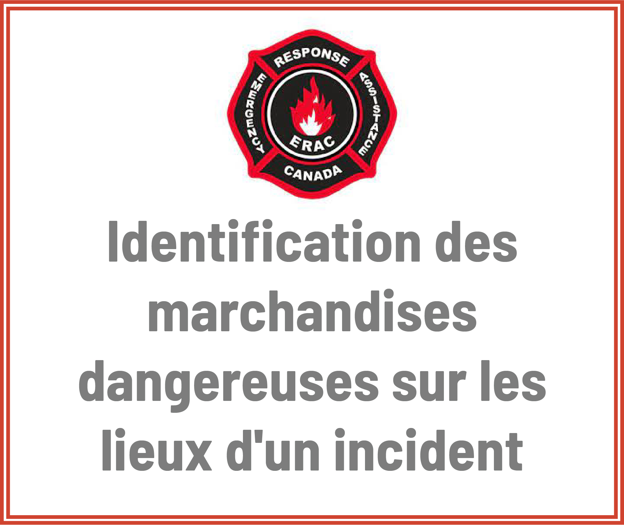 Ce cours assure que les intervenants de l’AIUC sont en mesure d’identifier les marchandises dangereuses sur les lieux d'un incident. Il décrit comment aborder les marchandises dangereuses de façon sécuritaire et prudente et les différents moyens (par exemple, numéro UN, plaque, type de contenant) d’identifier le contenu se trouvant dans un contenant.